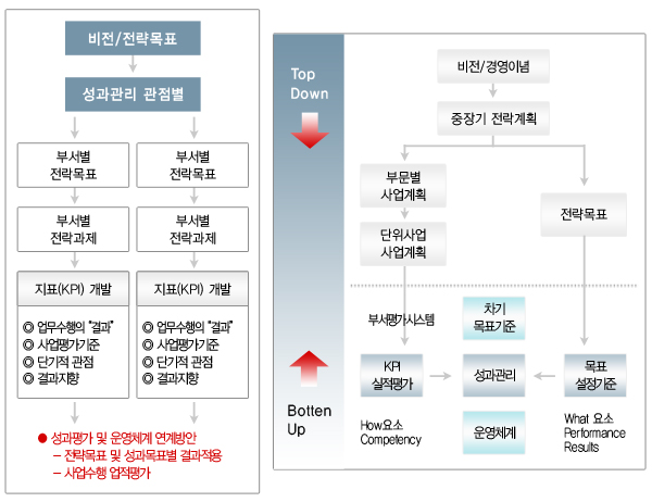 성과평가는 최종 결과지표인 재무적 지표뿐만 아니라 고객관점, 내부 프로세스 관점, 학습 및 성장관점 등을 고려한 원인과 결과를 통하여 기업의 자원을 균형 있게 관리하고 평가할 수 있도록, 전략달성을 위한 목표 및 과제는 Top-Down식으로, 실적결과는 Bottom-Up식으로 평가지표가 설계합니다.