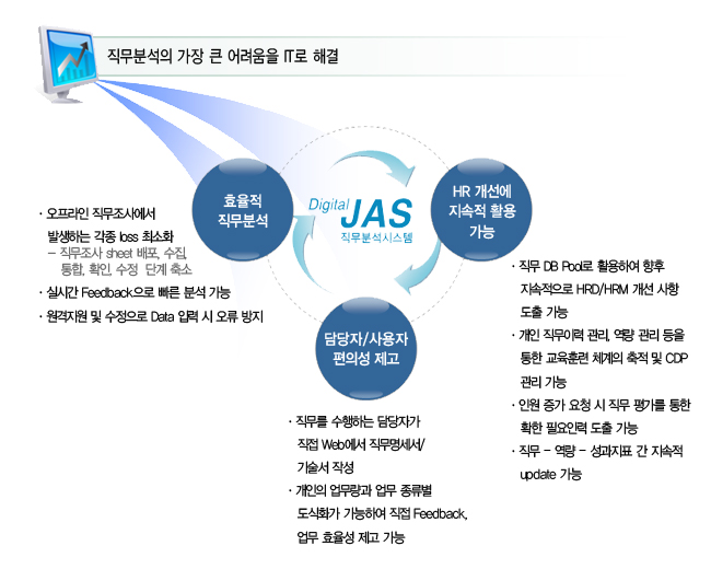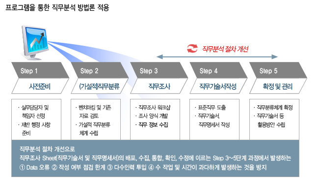 직무분석 과정에서 발생하는 불편과 오류를 개선하기 위해 Program을 통한 웹기반 직무분석시스템을 사용함으로써 신속성과 편리성을 도모하고 직무분석 절차를 개선합니다.