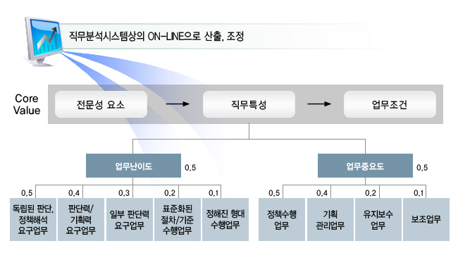 직무평가의 가중치는 전문성요소, 직무의 특성분석 결과로부터 도출한 핵심가치 (Core Value)를 반영하고 기존의 활용사례에 기반하여 상대적인 비중을 고려하여 도출하며, 이러한 가중치는 AHP의 Simulation결과 분석을 통하여 좀 더 정교하게 조정됩니다.