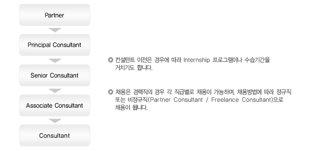 Career Opportunities Consultant 직급구조 Consultant 신규채용 채용분야 Business Consulting 분야 (인사/조직, 경영전략, 교육개발 등) 채용방식 1차 서류전형2차 ~ 3차 Round Interview 자격요건국내 외 대학원 졸업자 및 졸업 예정자 이상, 컨설팅 경력자 우대채용, 채용 Band는 개별 인터뷰시 결정 제출서류Resume 및 최종학력 성적증명서